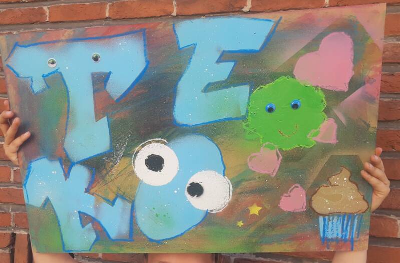 Wat doen we: Met verf, spuitbussen op waterbasis en sjablonen maken we een cool kunstwerk van 60cm op 40cm.