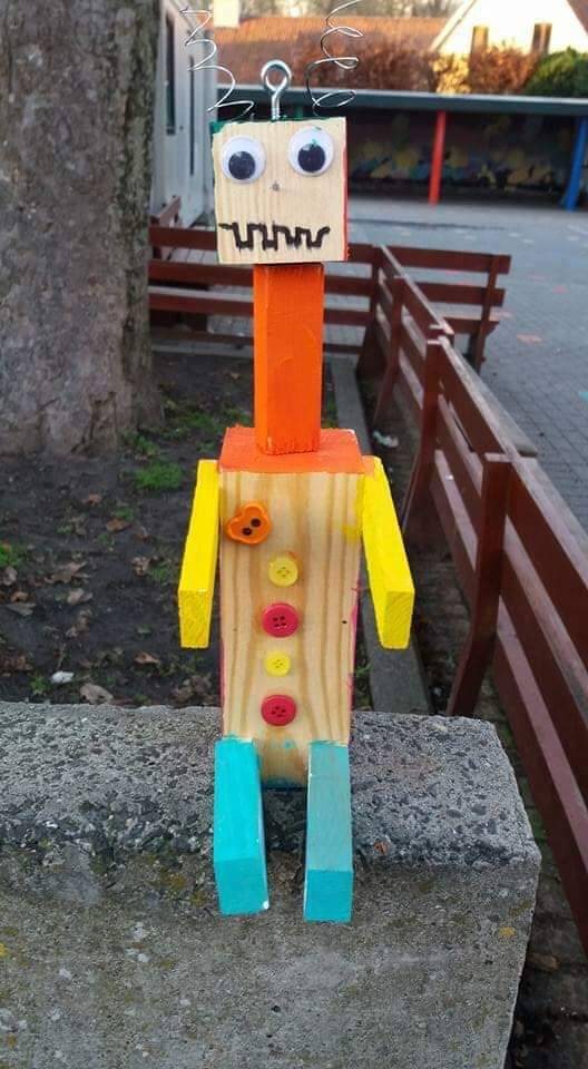Met hout, hamer, nagels, verf, allerlei vijzen en ander gek materiaal.